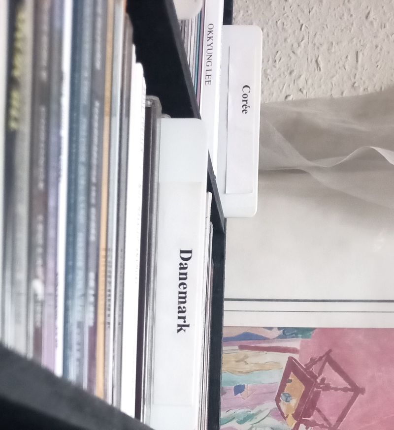 1996, création d’une base de données, il a mis un an pour tout enregistrer dans un fichier. Il m’explique qu’il référence plusieurs choses : le nom du groupe ou celui du compositeur, le nom de l’album, le label, la référence dans le label, puis le pays (l’internationalité), qu’il a ensuite une façon de classer, pour le rangement numérique, par année de sortie, mois d’achat, puis il glisse diverses notes quand compil, quand nom de groupe, quand groupe… Sa hantise : les personnes qui empruntent et rangent mal.