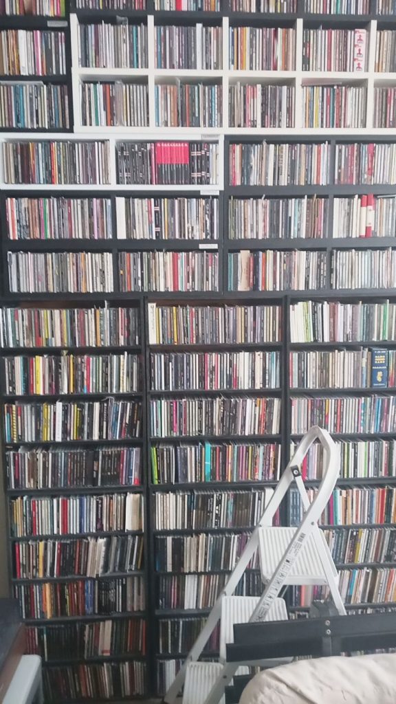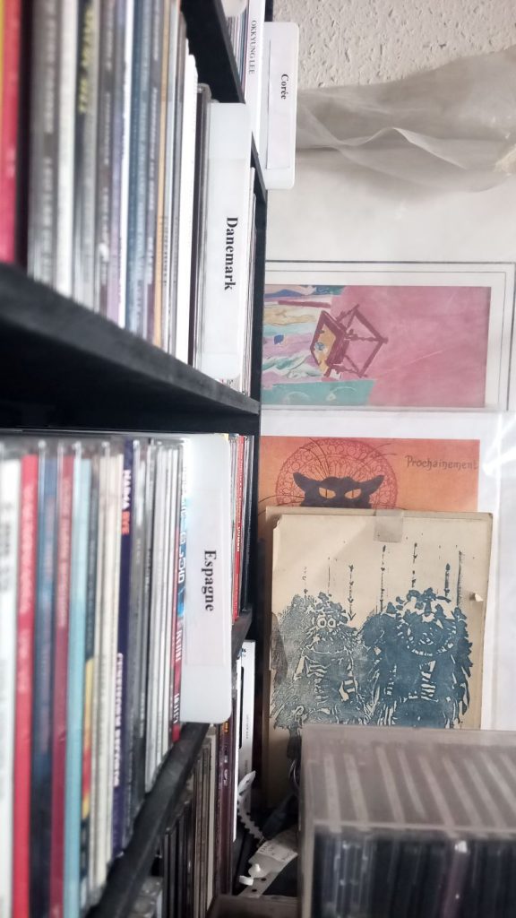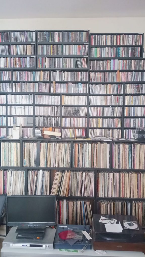 Le bureau-salon-pièce à vivre-atelier habillée tout le long des trois murs aveugles par des étagères noires, du sol jusque bientôt au plafond. Ca fourmille d’une multitude de rectangles étroits de 7 mm sur 120 et de 3mm sur 330, même entre les deux vitres de l’autre pour accueillir les 3500 vinyles et 15000 CD, 200 cassettes. Moquette au sol, un petit sofa deux places, des choses éparses sur la table basse du salon dont les derniers disques arrivés qu’il n’a pas encore eu le temps d’écouter.