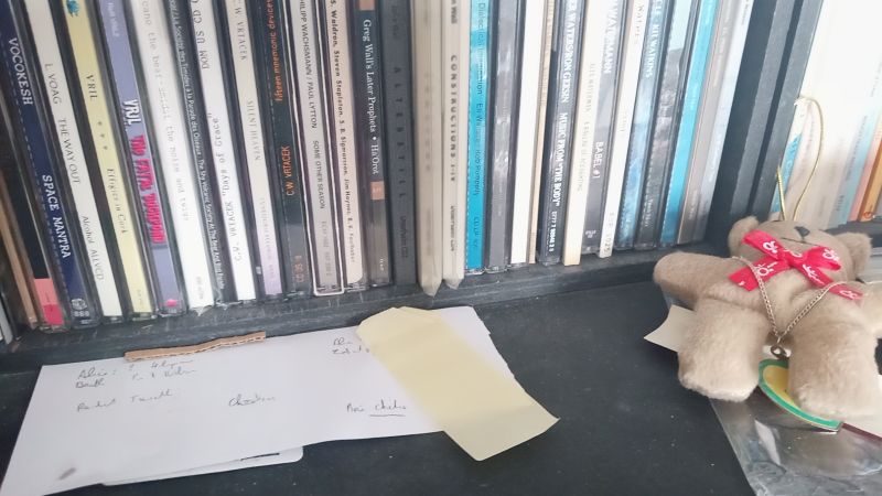 En sus des disques et cassettes, j’ai aussi remarqué des disquettes en haut à gauche sur l’étagère du mur du fond derrière le sofa et, peut-être si ma mémoire ne me joue pas des tour un mini-disc, mais il est possible que j’affabule avec mon goût pour les contes.