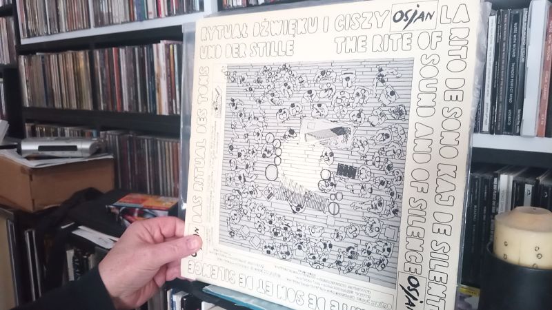 Boîtier deux tranches, fermé et retenu par un boulon. On est dans le disque-objet d’artiste un peu comme il existe la catégorie « livre d’artiste ». J’apprécie que leurs disques foisonnent de feuillets volants imprimés, d’images, de dessins, d’illustrations, de textes courts, stickers ou autres sortes de minis goodies. J’ai toujours aimé ce qui dans l’art se dissémine babillant un peu foutraque fait main et qui parle en sous-texte de l’inachèvement. Ensuite, il me montre les CD de Terje Isungset Ice concerts, Winter songs et Hibernation, ces objets sont plus le résultat du production industrielle chiadée, ça me rappelle le livret de la pochette d’Enigma, Le roi est mort, Vive le roi ! Parce qu’imprimée sur feuille de plastique transparente. Pour Isungset, les carrés de plastique qui viennent surligner des visuels imprimés blanc-bleuté présentent des découpes géométriques évoquant l’univers aquatique à l’état solide et glacé.